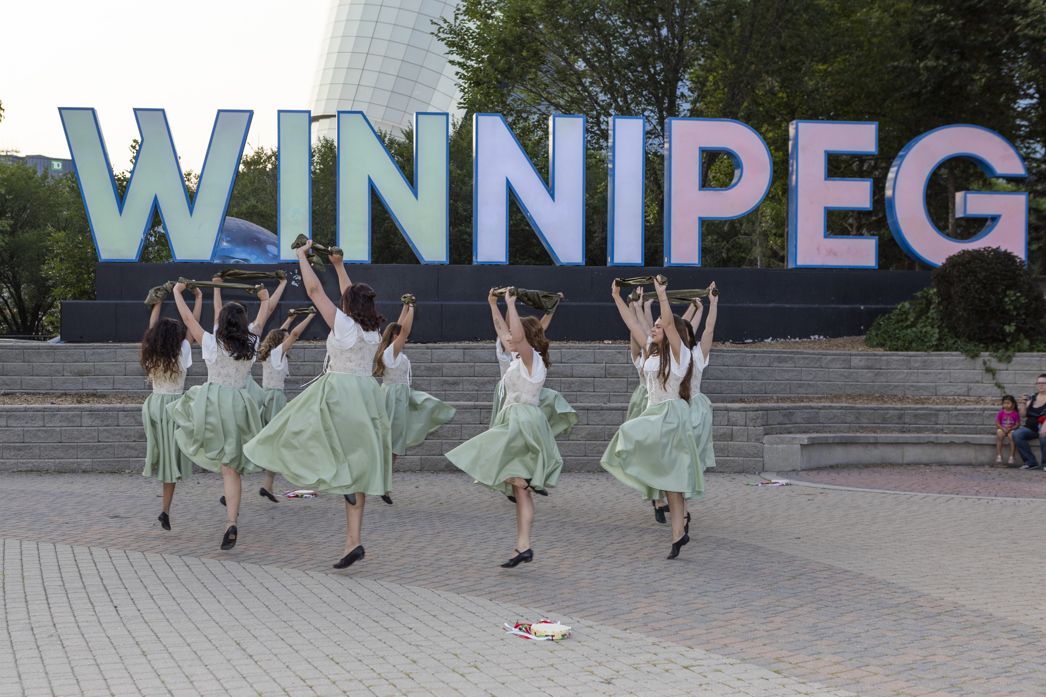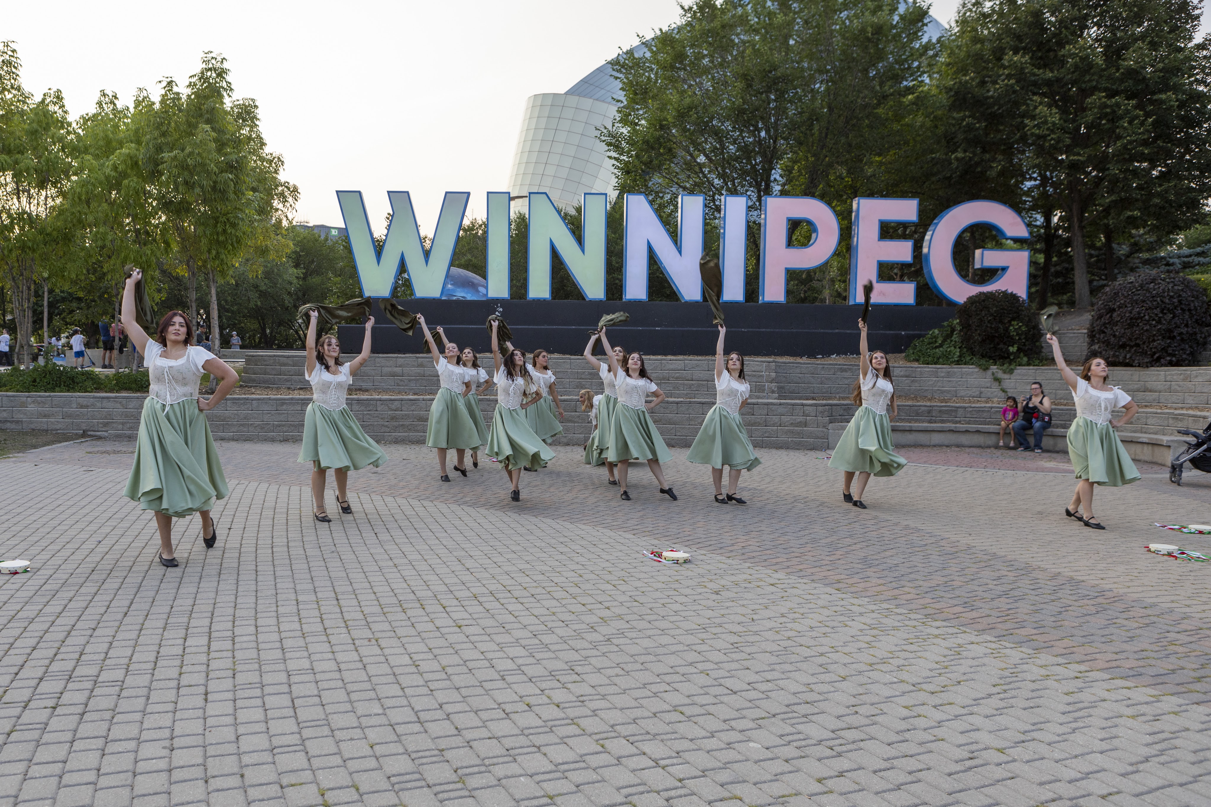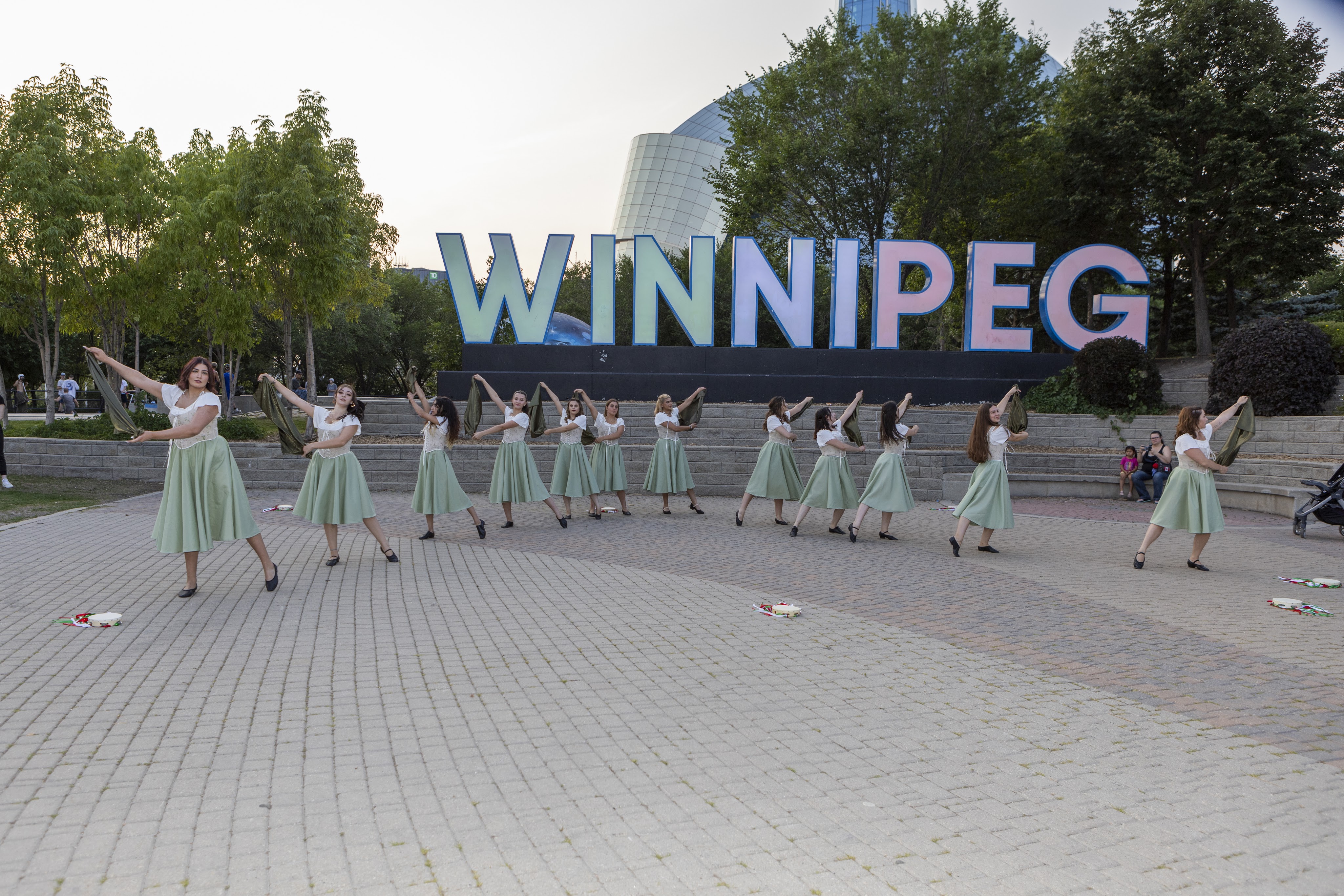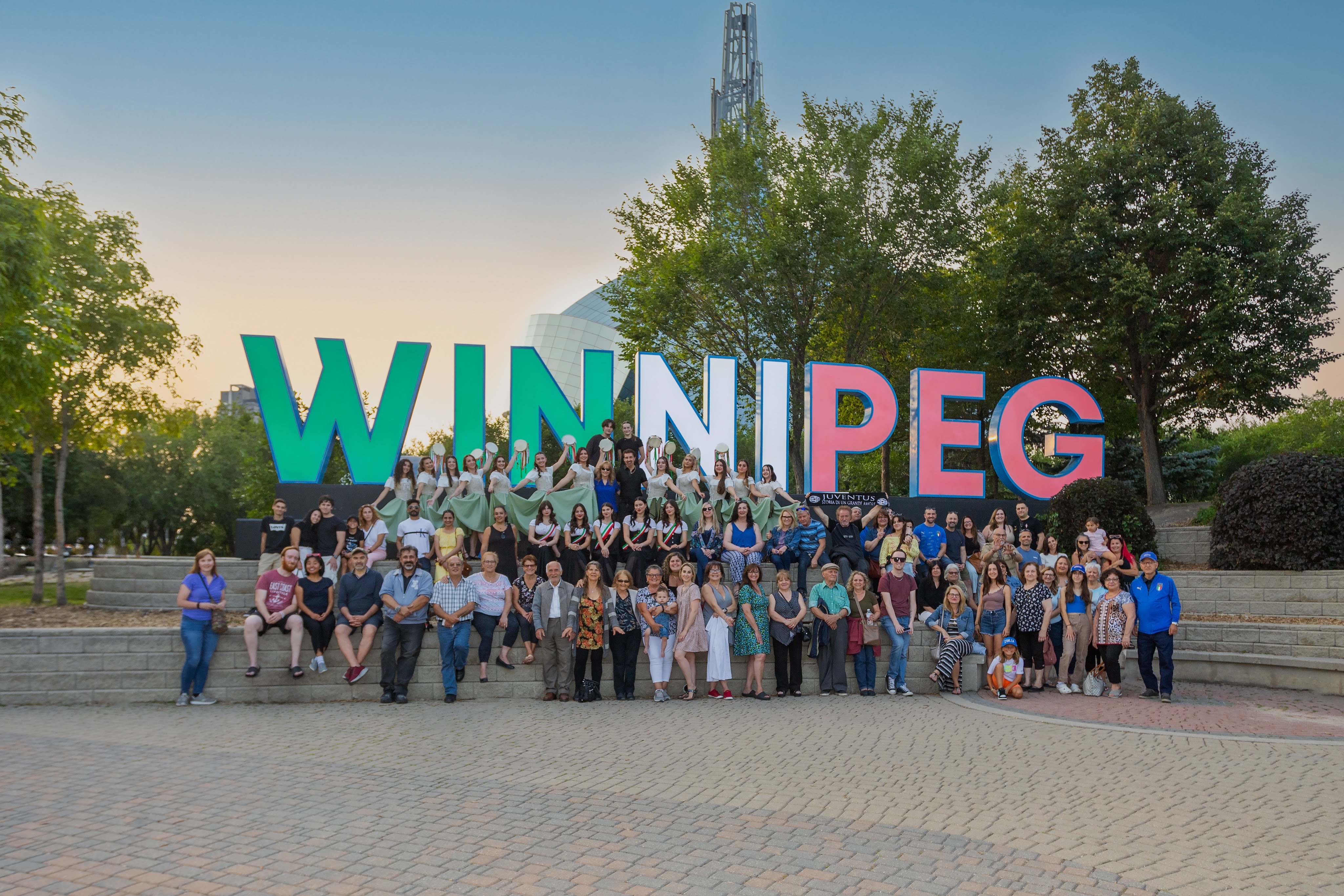 On Thursday, July 20th, 2023, the Stelle di Calabria Anziani group joined the Italian community out at The Forks National Heritage Site for a special lighting of the Winnipeg sign and the Esplanade Riel Footbridge in the Italian Flag colors to celebrate the 25 year anniversary of the opening of the Centro Caboto Centre. To help with the event, Founder Tabitha and Anziani dancer Domenica, organized bringing in a sound system to create the mood of a piazza where the Anziani group grabbed other community members and had everyone dancing the tarantella. Once the sign was lit, the ladies performed a sneak peak of their set for Folklorama.