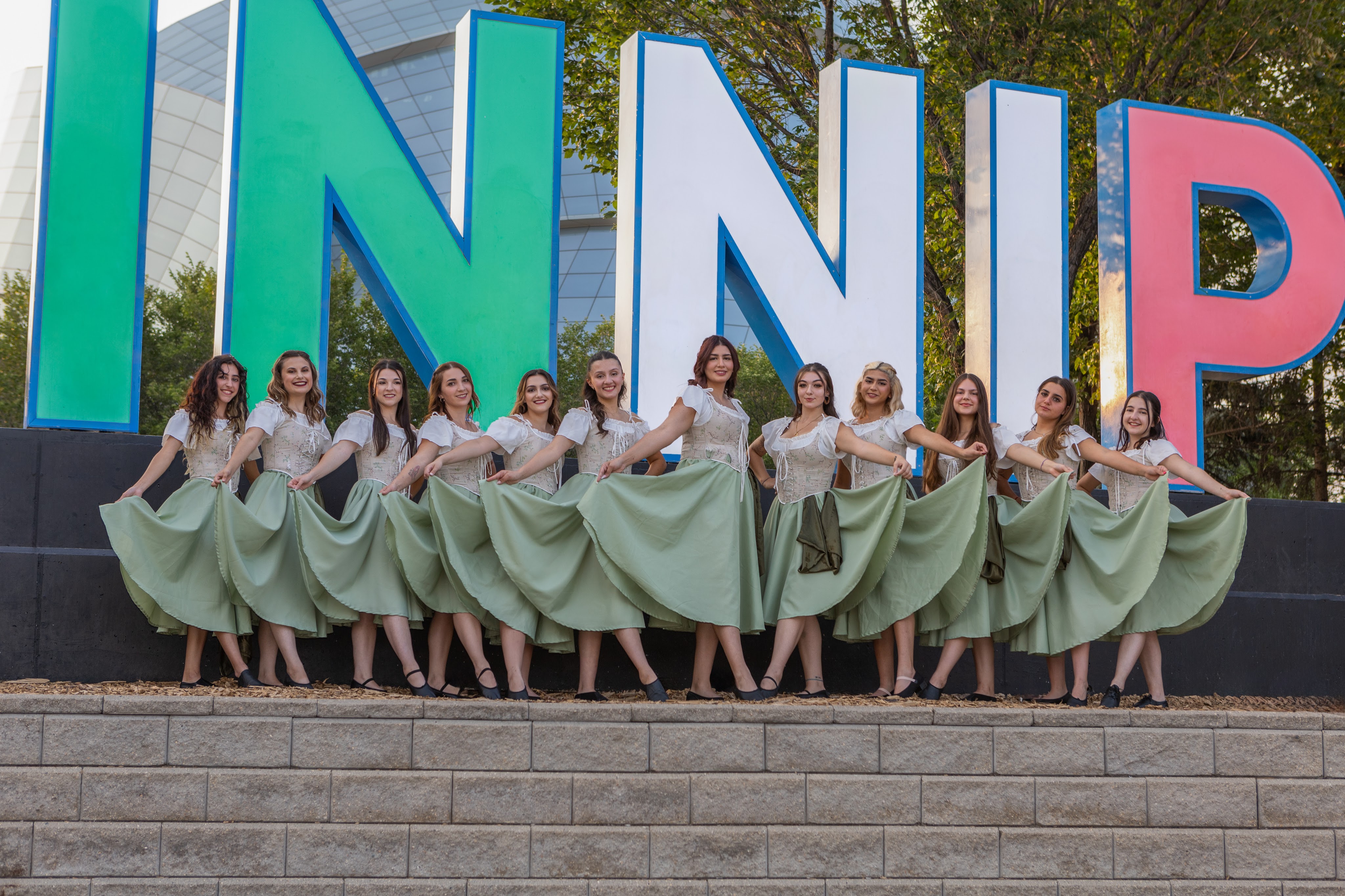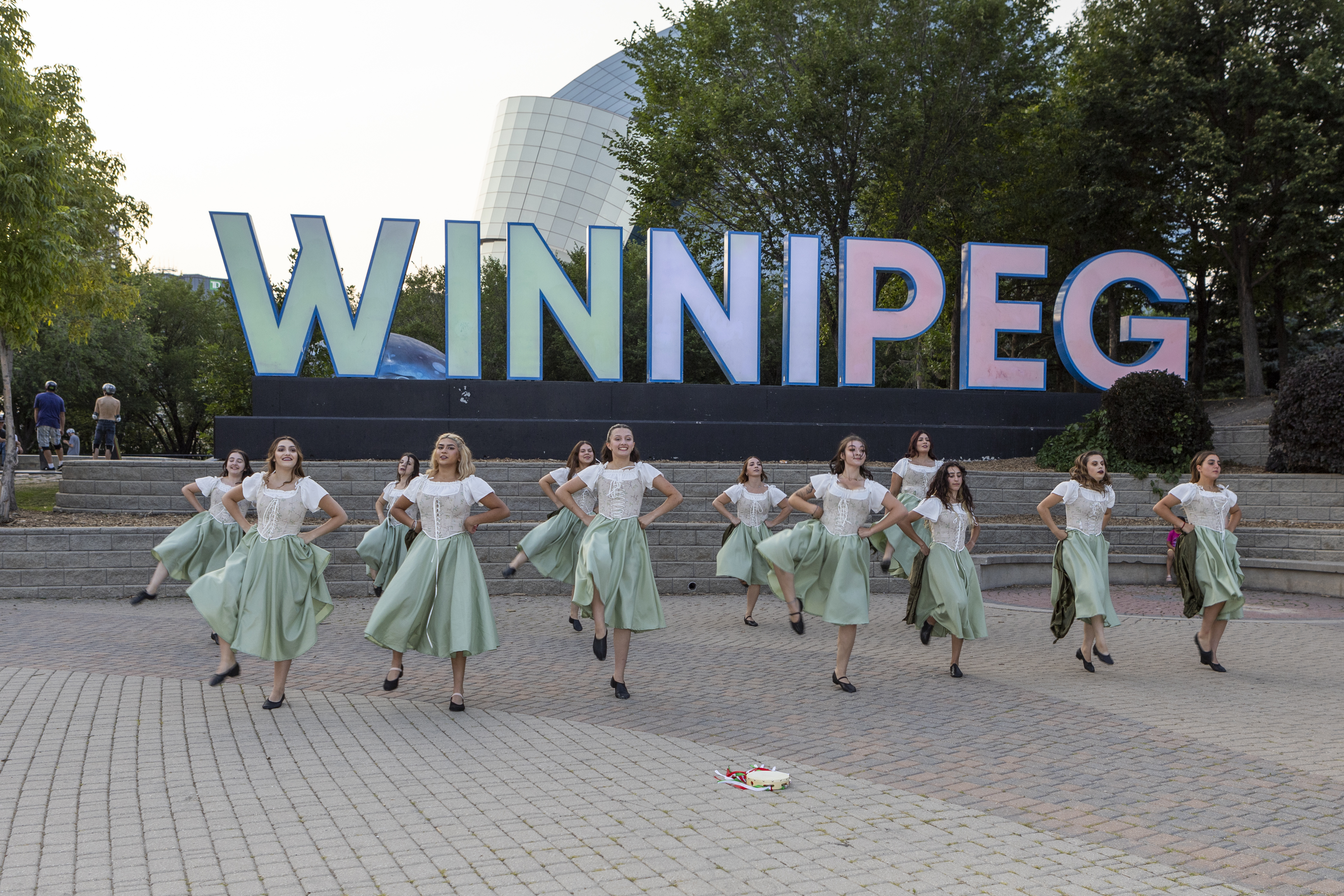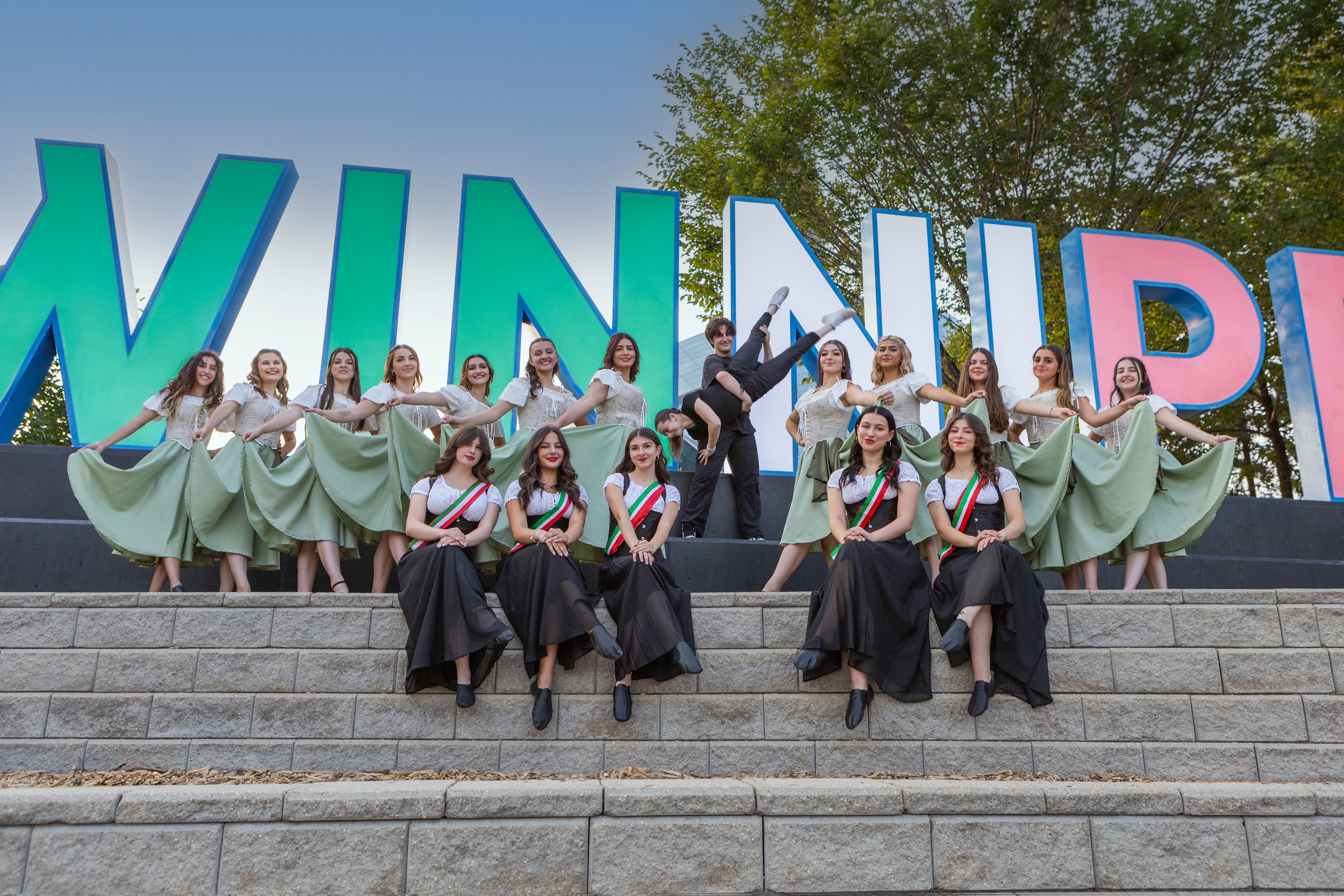 On Thursday, July 20th, 2023, the Stelle di Calabria Anziani group joined the Italian community out at The Forks National Heritage Site for a special lighting of the Winnipeg sign and the Esplanade Riel Footbridge in the Italian Flag colors to celebrate the 25 year anniversary of the opening of the Centro Caboto Centre. To help with the event, Founder Tabitha and Anziani dancer Domenica, organized bringing in a sound system to create the mood of a piazza where the Anziani group grabbed other community members and had everyone dancing the tarantella. Once the sign was lit, the ladies performed a sneak peak of their set for Folklorama.