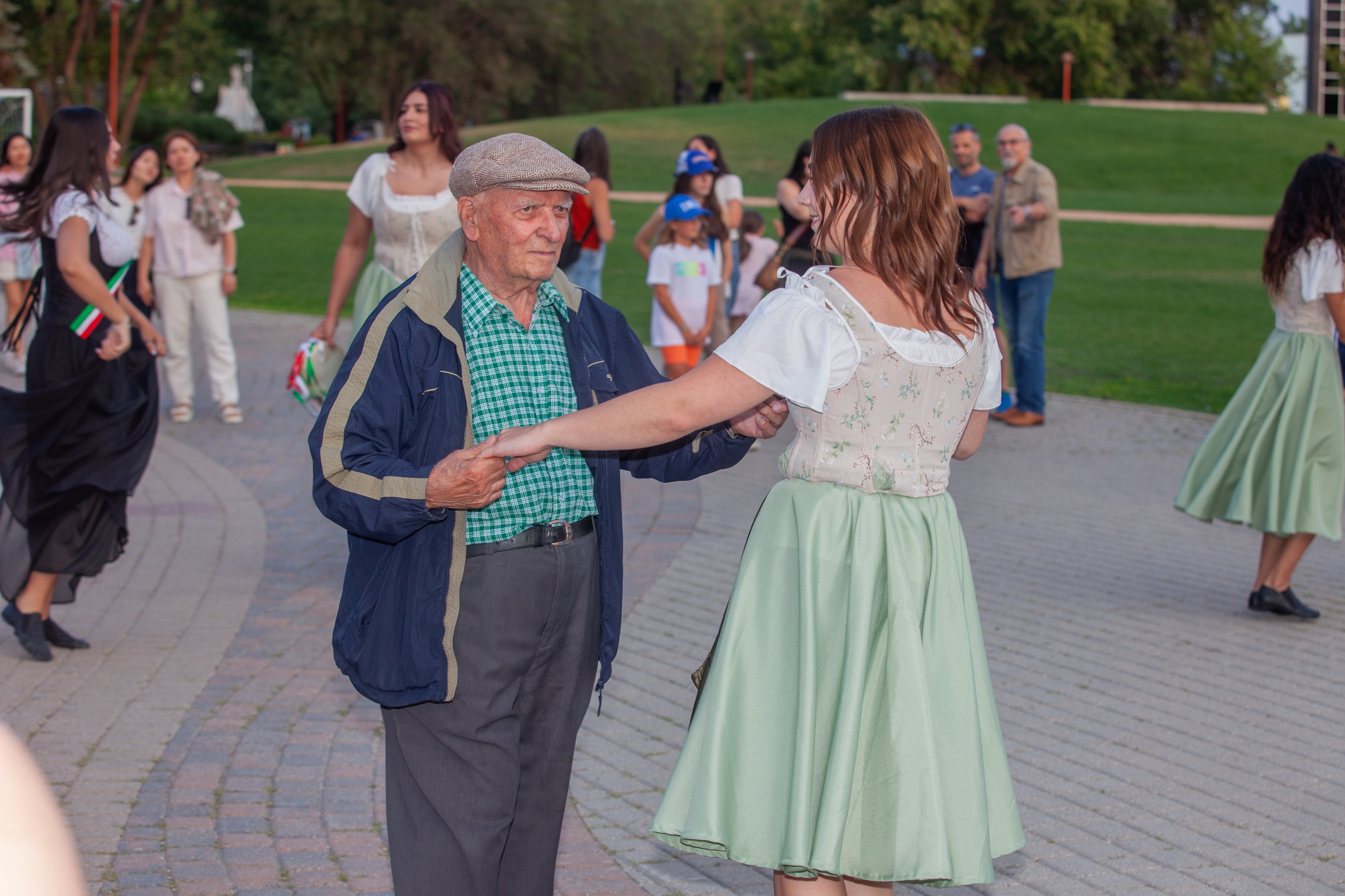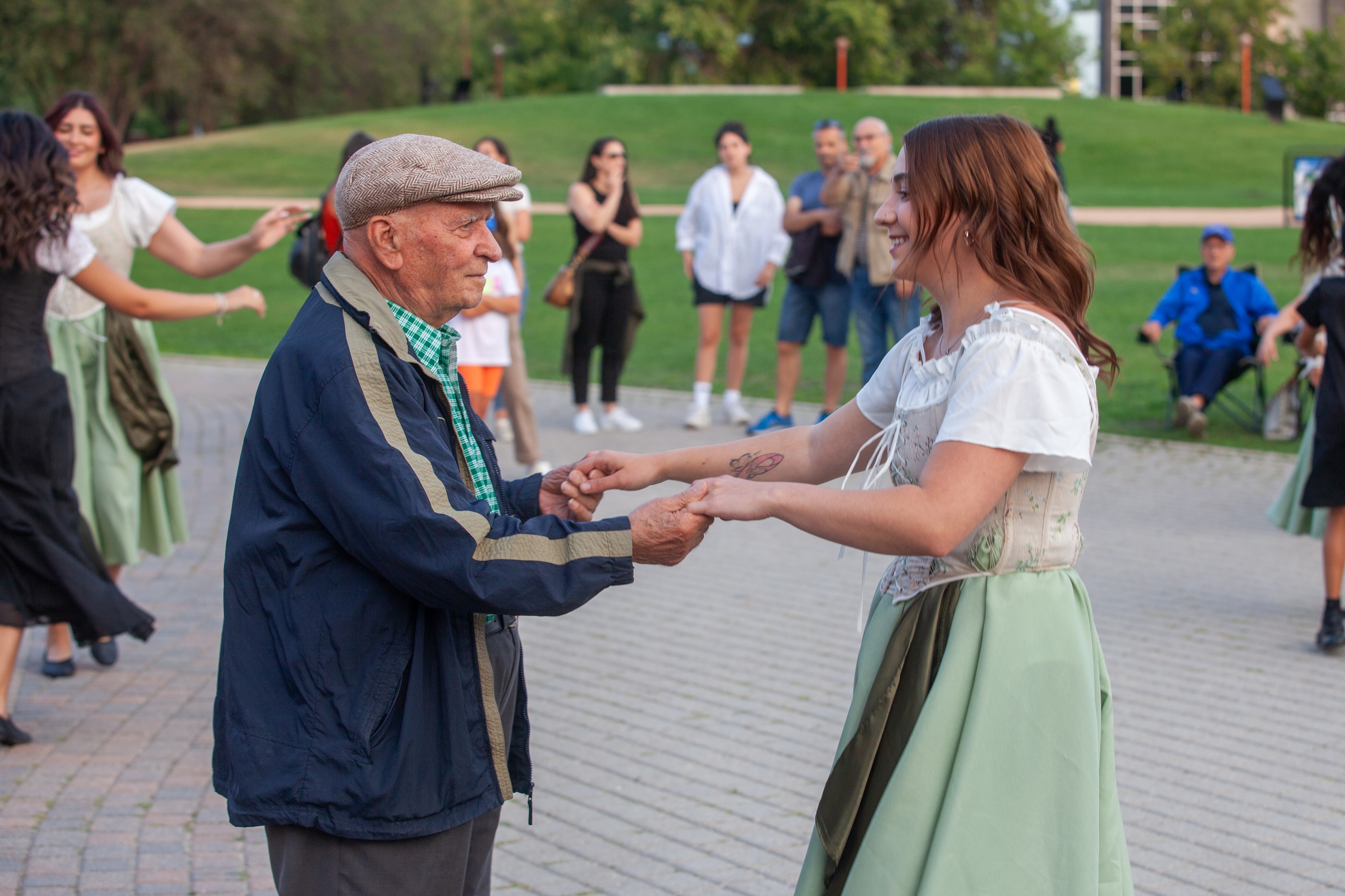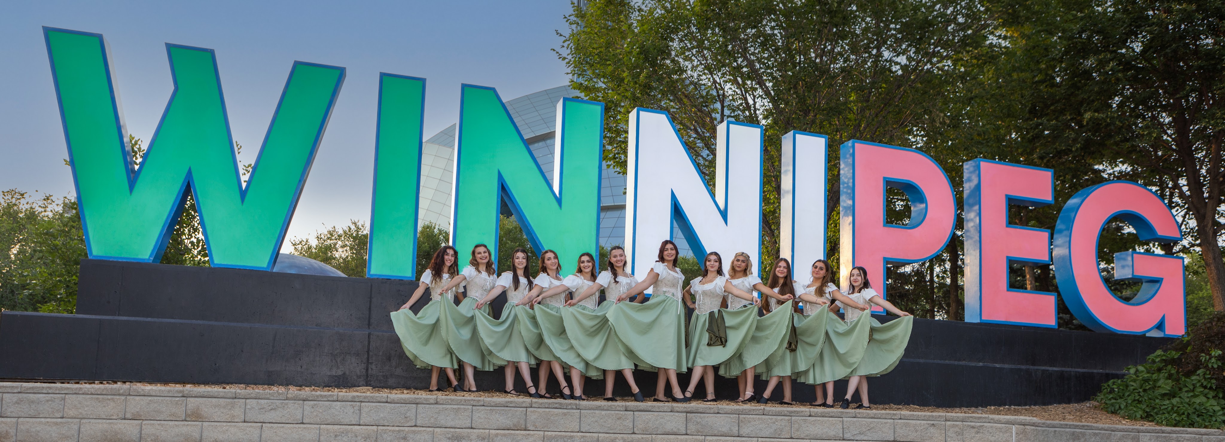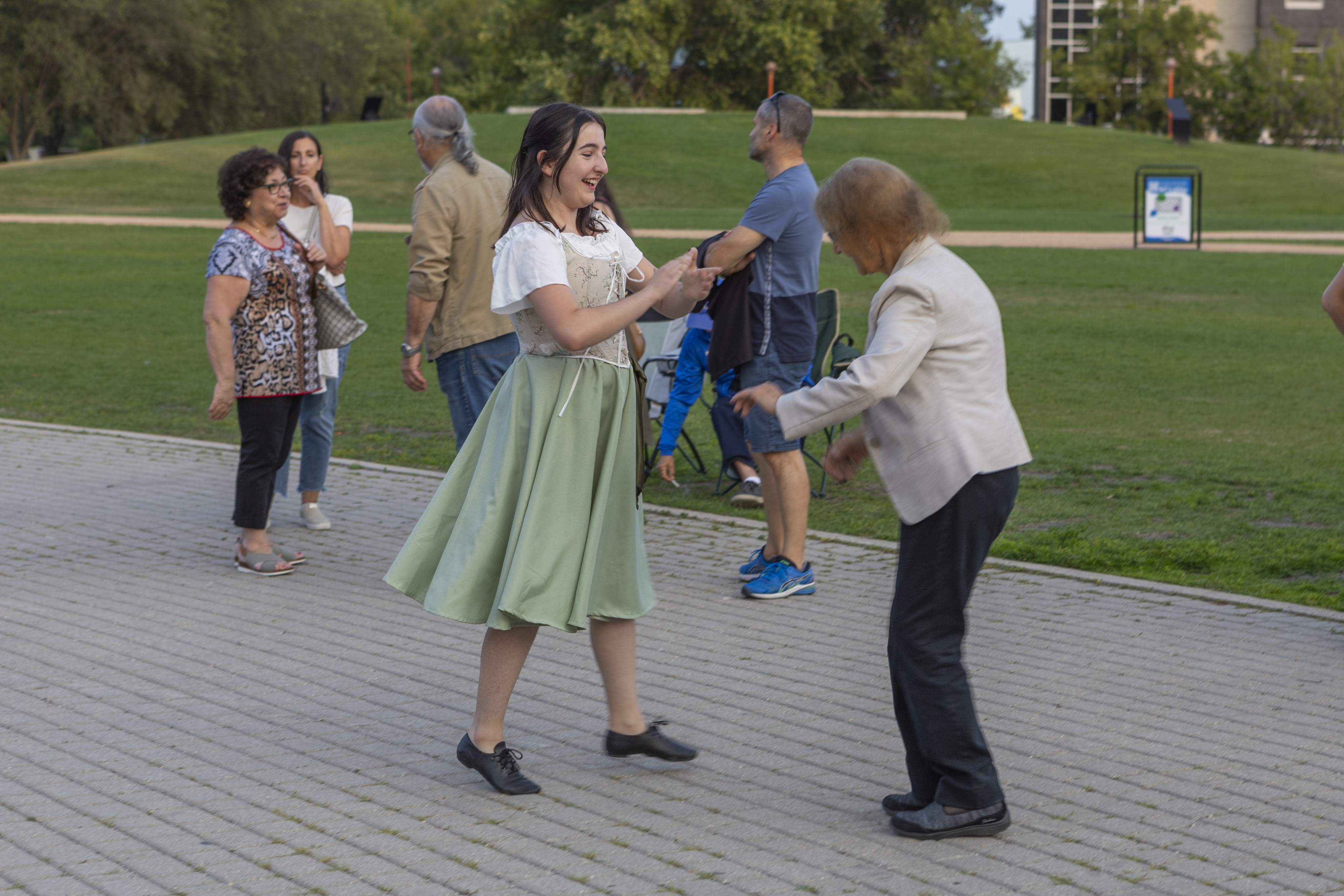 On Thursday, July 20th, 2023, the Stelle di Calabria Anziani group joined the Italian community out at The Forks National Heritage Site for a special lighting of the Winnipeg sign and the Esplanade Riel Footbridge in the Italian Flag colors to celebrate the 25 year anniversary of the opening of the Centro Caboto Centre. To help with the event, Founder Tabitha and Anziani dancer Domenica, organized bringing in a sound system to create the mood of a piazza where the Anziani group grabbed other community members and had everyone dancing the tarantella. Once the sign was lit, the ladies performed a sneak peak of their set for Folklorama.